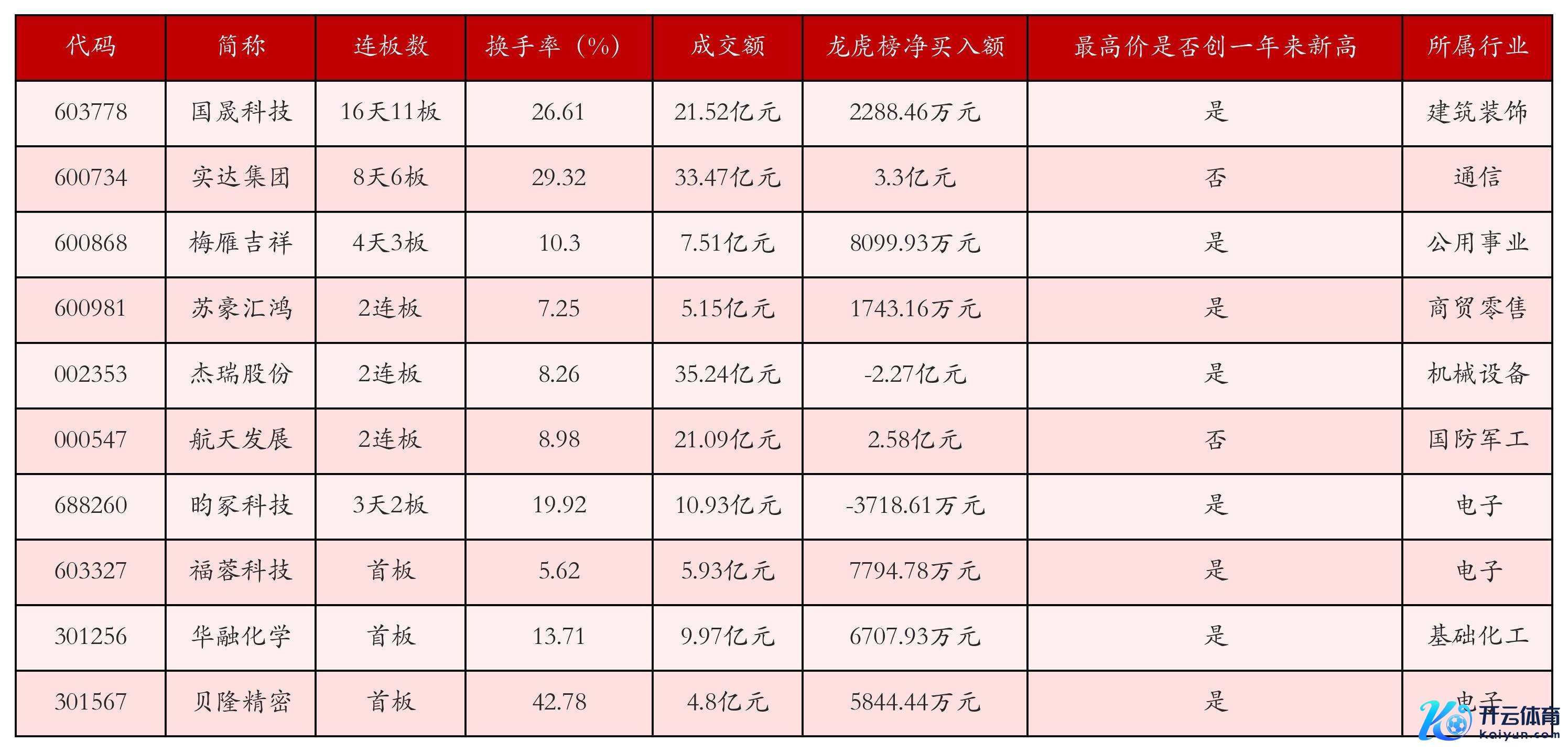 适度12月1日收盘,上证综指高潮0.65%,收于3914.01点,深证成指高潮1.25%,收于13146.72点,创业板指高潮1.31%,收于3092.5点。当天沪深两市A股预备75只涨停,概述现时连板数以及当日龙虎榜数据,其中较为强势的前三只个股离别为:国晟科技(603778)、实达集团(600734)与梅雁祥瑞(600868)。当天强势个股前10位具体数据见下表: