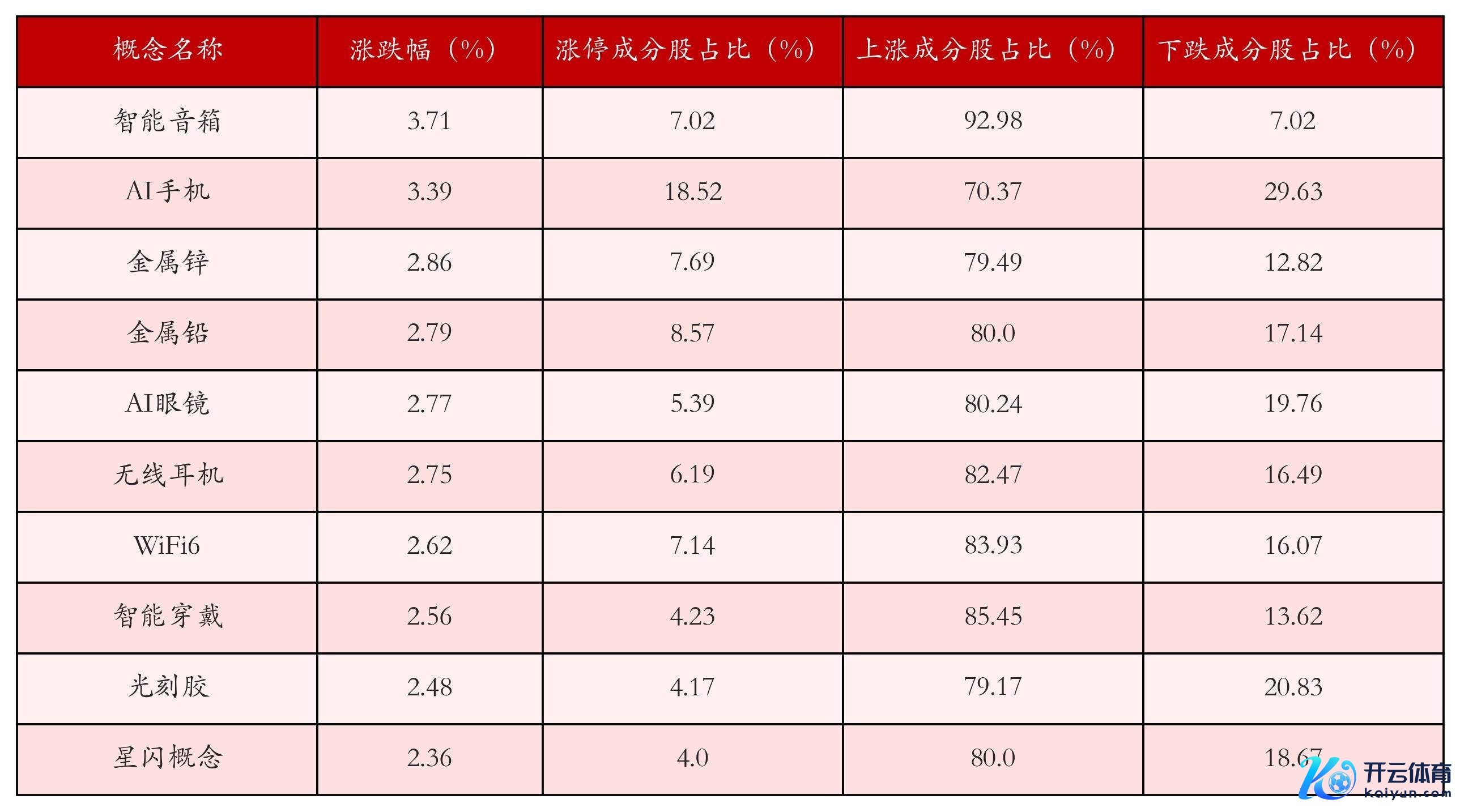 把柄A股主见涨跌幅与所对应的股票池概述分析,涨幅靠前的三个主见板块离别为:智能音箱、AI手机与金属锌。排行前10位的主见板块相干数据见下表: