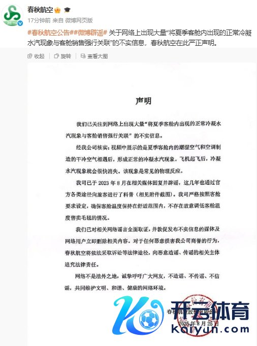 春秋航空:网传“将夏日客舱内出现的往时冷凝水汽振作与客舱销售强行关联”为空幻信息春秋航空:网传“将夏日客舱内出现的往时冷凝水汽振作与客舱销售强行关联”为空幻信息