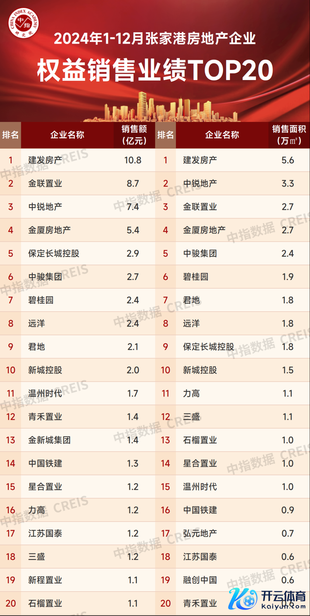 2024年1-12月,保利发展以66.9亿元、26.9万平的销售事迹位列昆山市全口径销售事迹榜单榜首,全口径销售榜单TOP20入榜门槛值为2.7亿元、1.7万平。权柄榜单中,保利发展、中建七局、招商蛇口包揽TOP3,权柄榜单TOP20入榜门槛值为1.6亿元、1.0万平。
