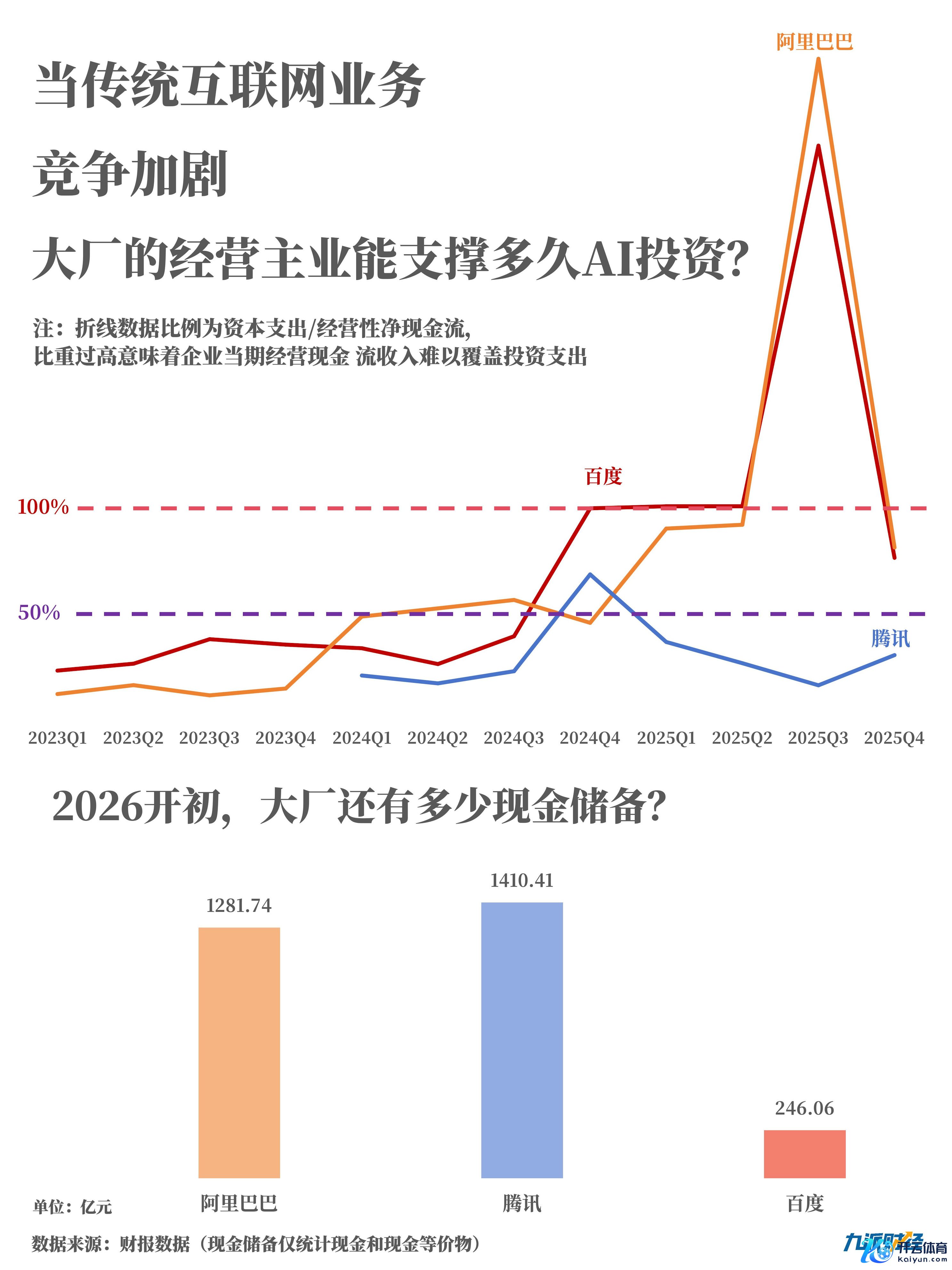 把柄财报数据骄横,百度2023年至2025年三年间本钱开销区分为112亿元、81亿元和121亿元;腾讯本钱开销在2024年飞速加多到768亿元,同比增长221%,2025年进一步增至792亿元;阿里巴巴的本钱开销则从2023年244亿元增长至2025年的1039亿元,冲突千亿。