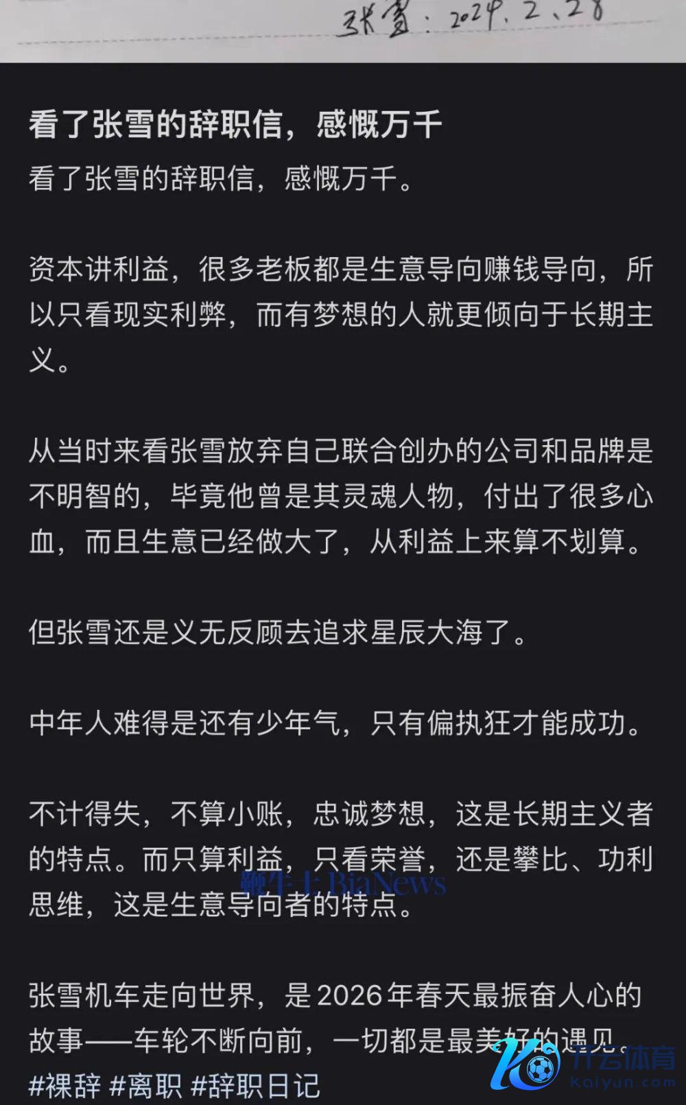 而这两天,在酬酢媒体上,大批网友晒出张雪从凯越辞职的辞职信发表感言,并不测走红。